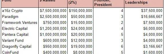 3.a16z和Paradigm的人均核心领导层管理费最高再次强调,a16z是非加密原生公司,这个数字的准确性存疑。抛开a16z不谈,基于公开的信息和对领导层title的主观判断,Paradigm在核心领导层管理费方面遥遥领先。我们不知道这些公司与非公司创始人的高管之间协议的具体细节,但这是一个开始。