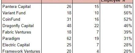 2.PanteraCapital的管理层与员工比率是最高的这个数字只说明了哪些VC的领导人员比普通员工的数量要多。它可以被视为积极的或消极的,这取决于你如何看待它。例如,PanteraCapital以58%的比例领先。一方面,这可以被看作是他们雇佣了足够的人员来做工作,能够为你的投资组合起到实际的支持作用。另一方面,这也意味着这些领导角色将获得更少的费用分成。几个月前,Pantera有一群高管离职。我对这个消息持保留态度。另一方面,我确信a16z作为一家非加密原生公司,有更多的员工负责处理基金的运营方面,他们可能并非隶属于a16z加密团队。这就是为什么他们的数字是最低的,只有10%。