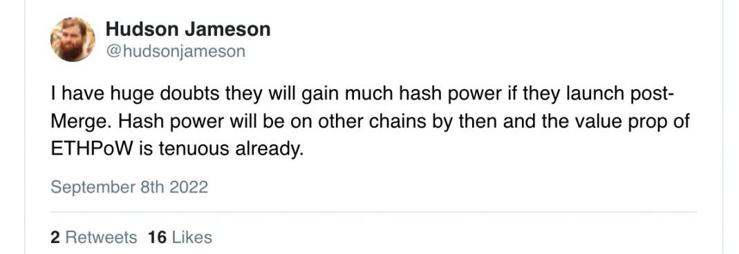 以太坊基金会社区经理HudsonJameson表示:「我非常怀疑,如果他们在合并后启动,他们将获得多少算力。届时算力将在其他链上,ETHPoW的价值支撑已经非常脆弱了。」EthPoW的总结如下: