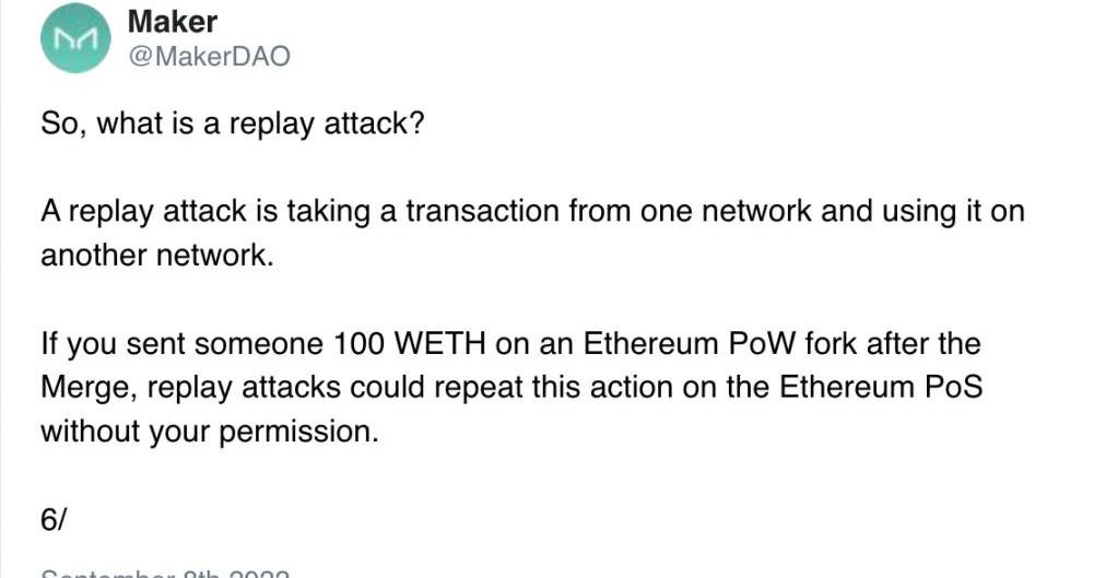 一些可能会被重放的交互示例:在分叉的以太坊PoW链上,直接从你在分叉之前在以太坊使用的同一地址与任何Maker合约进行交互。确定ETHPOW是否值得花费精力