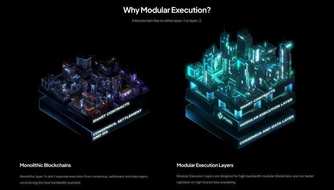 最初FuelV1是以太坊的Layer2,使用OptimisticRollup于2020年底部署,而目前的Fuel开始了V2高速模块化执行层计划。团队认为Layer1架构正在转变,从共识、数据可用性和执行紧密耦合的整体设计转向模块化发展,执行与数据可用性和共识分离。这种分离允许在基础层进行专业化,从而增加带宽容量,Fuel的设计可以利用这种额外的带宽。Fuel是模块化区块链的执行层,提供高安全性和灵活的吞吐量并能具备可互操作图灵完备的智能合约。
