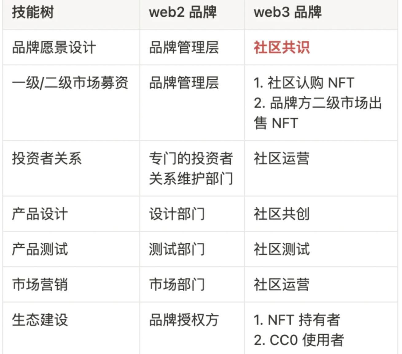 web2和web3品牌关键区别我画了一张图来更清晰的描述web3和web2品牌的2个关键区别,也是2个双赢策略1.双赢策略1:社区第一,「品牌-社区」双向关系相比起web2品牌的「品牌第一」或「产品第一」,以及「品牌-消费者」单向关系;web3品牌需要「社区第一」,且「品牌-社区」具有双向关系。为什么需要社区第一?从时间顺序上,先社区再品牌:前文已经阐述过,品牌背后不只是消费品。也成为了消费者的个人资产,所以消费者同时是投资者。甚至用户首先是投资者,然后才是消费者,因为消费品的打造需要一定时间,而在打造之前就需要有启动资金,需要构建「投资人社区」,所以从时间顺序上,先社区再品牌。从归属关系上,先社区再品牌:因为用户同时具备投资者/消费者双重身份,作为品牌的owner,有权利参与品牌的定义和建设所以从归属关系上,先owner后品牌从重要度上,先社区再品牌:「品牌-社区」构成了双向关系,品牌不止是借助社区成长和传播,社区用户也会投入更多情感和精力在其中,帮助品牌/个人资产成长。这个过程中凝结了强大的社区共识,而品牌愿景依托于这份共识。所以重要度顺序是」社区→共识→品牌」,社区是品牌的立足之本,没有社区的品牌则是无本之木,无源之水2.双赢策略2:衍生社区和品牌自生长,扩大原品牌生态这也是web3品牌和web2非常不一样的一点,通过社区用户力量打造更大的衍生社区和品牌生态,反哺原品牌,上图中我用粉红色标注了出来不同于web2品牌自己掌控IP以及从中盈利,绝大多数web3品牌都把IP授权给了NFT持有者,CC0品牌更是把IP开放给了所有人。社区用户可以使用持有的IP或CC0IP,基于原品牌社区来启动衍生品社区,一方面建立自己的衍生品牌生意,另一方面扩大原品牌的影响力和生命周期,打造双赢局面上面是web3品牌打造mindset上的变化,下面我们在来比较下web2和web3品牌方需要核心打造的技能树有何不同。可以清晰的看出,从种类上还是那些事,但和web2所有事情都由品牌内部控制不同,web3品牌所有运营的基础都是社区,如何把所有的工作和」社区运营」结合起来,这是web3品牌方实际工作中的最大挑战。简而言之,建立web3品牌本质上是在打造社区。