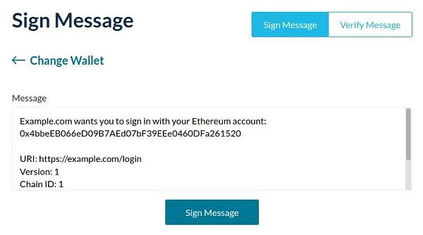EIP-4361描述了使用签名消息的现有web2服务的身份验证方法。用户可以使用自己的私钥(带有相应的地址)进行身份验证,而不是使用用户名和密码的组合。例如,可以使用自己的私钥对这样的消息进行签名: