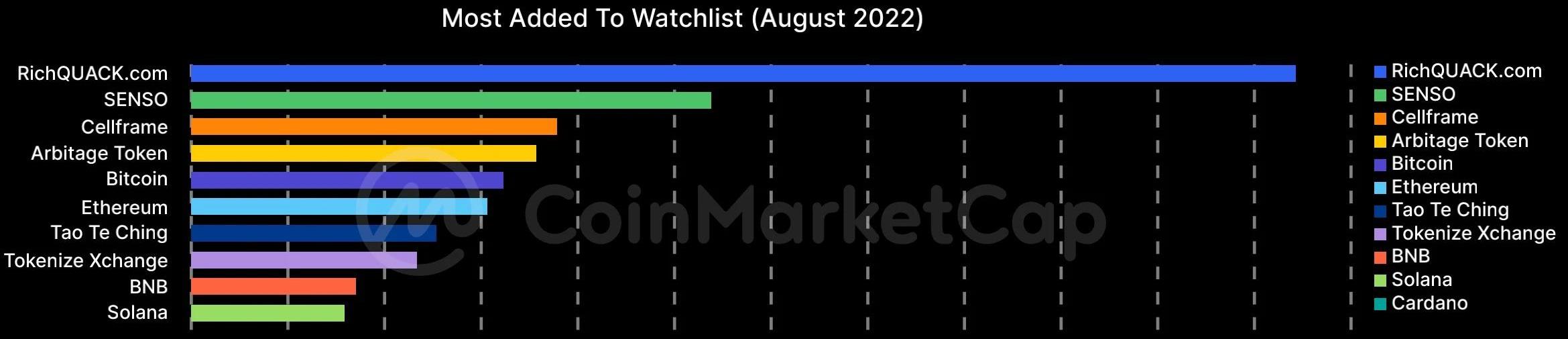 2022年8月从排名前200的加密货币中可以了解到Solana、比特币和以太坊占据了8月份浏览次数最多的加密货币的前三名。Solana的关注度从7月份的第五名跃升至8月份的第一名。这主要是由于以下原因:据Elliptic报道,Solana黑客攻击发生在8月2日,近8000个钱包中超过580万美元的SOL、基于Solana的代币和NFT被清空。黑客攻击来自4个钱包,目标是Solana浏览器钱包的私钥,如Phantom、Slope、Solfare和TrustWallet。据报道,在黑客攻击期间,Solana区块链没有受到任何损害。然而,也不全是坏消息——Solana的“验证者健康报告”于8月发布,评估了网络的恢复力和去中心化。该报告强调了三个关键指标:验证者数量、中本聪指数和分布性。在六大洲有超过3400个验证器,其中1900个是生成块的共识节点,1500个是RPC节点。更重要的是,自2021年6月以来,平均每月新增194个节点。中本聪指数是一个用来评估网络去中心化程度的指标。简单地说,它是对停止共识所需的最小节点数量的度量。Solana得31分,是其他权益证明网络中得分最高的之一。据报道,Solana的分布跨越地理位置、数据服务器和控制节点的实体普遍分布广泛。而比特币和以太坊仍然在浏览次数最多的代币中位居前三。哪些代币被添加到监视列表中最多次?