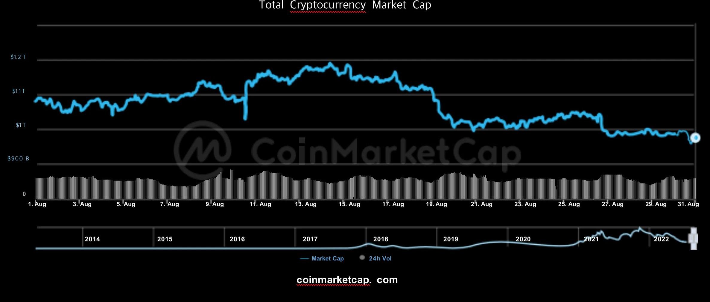 仅在8月份,加密货币总市值就从1.082万亿美元下跌到1万亿美元以下,跌幅达9.97%。