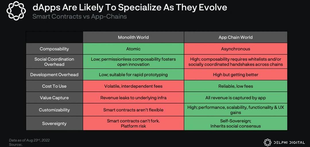 在成本方面,虽然专用链从来没有像现有链上的智能合约那样容易部署,但我们相信,随着技术的成熟和InterchainSecurity等开发项目的上线,差距已经大大缩小,并有可能继续缩小。真正的缺点是失去了同步可组合性。我们已经看到了以太坊上由代币再抵押驱动的DeFi的增长带来的好处,而且可能还有一长串尚未发现的无许可组合性的用例。虽然这很重要,但这里有两个重要的反驳。首先,我们认为只有少数几种应用程序真正受益于同步可组合性。这些主要是DeFi的用例,对于这些用例,代币的再抵押可以说是至关重要的。也就是说,即使是DeFi,也可以争论同步合成性是否真的有必要,dYdX的成功就是证明。对于大多数其他的DApps,我们认为只要有强大的跨链工具来移植资产,并使与不同的DApps互动的用户体验无缝衔接,异步组合性是可行的。其次,专业化并不一定意味着在一个链上部署一个单一的应用程序,而是意味着一个应用程序的集群,这些应用程序可以很好地协同工作或促进特定的用例。例如,虽然Osmosis通常被看作是一个AMM链,但它正在发展成为一个DeFi链,上面部署了许多不同的dApps。我们相信,受益于可组合性的应用程序将自然地倾向于聚集在专门的链上,有效地允许需要它的dApps"选择加入"可组合性。由于这些原因,我们期望所有的活动不是凝聚在一个单一的单体链上,而是演变成一个由相互连接的专业链/rollups组成的网状结构,围绕特定的使用案例组织起来。
