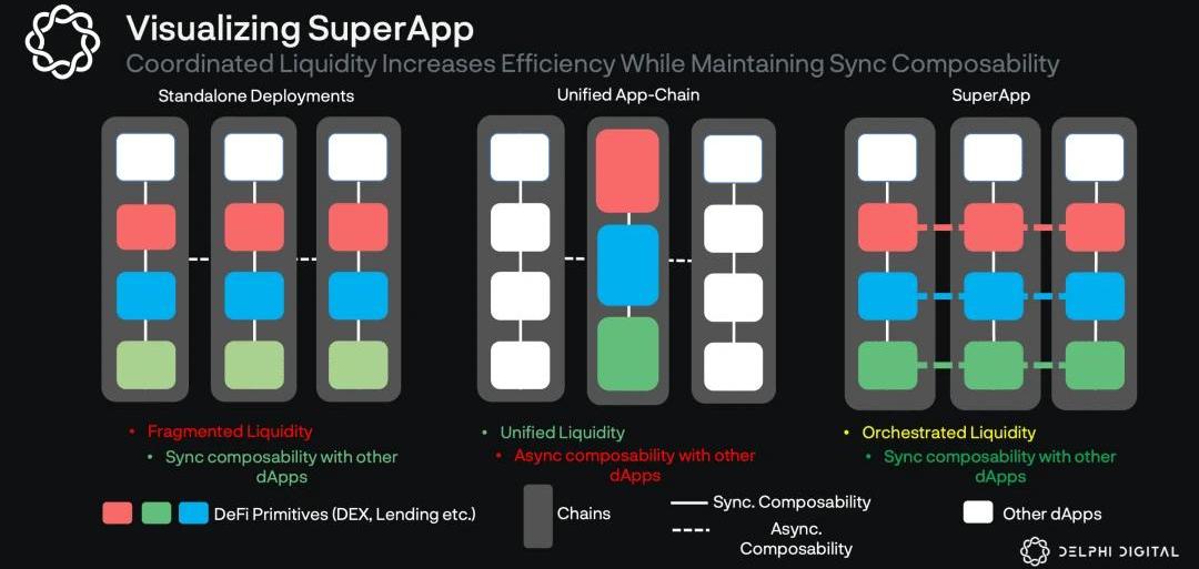 综上所述,我们认为,虽然DeFi应用层有可能被重新聚集,但区块链层将进一步碎片化,dApp团队/社区越来越多地选择部署自己的专有应用链。然而,我们认为这些链中的每一个都不太可能分拆出自己的DeFi生态系统,因为:a)它迫使每个链重建整个DeFi生态系统,这是一个困难的任务;b)导致流动性分散和次优的用户体验。相反,我们相信会有一些以DeFi为重点的中心,特定的应用程序链将其代币/经济部署在这些DeFi中心中的一个或多个。我们用来形象化的一个比喻是,专门的应用程序链是郊区,桥梁提供运输层,将这些郊区与城市中心的金融中心连接起来。鉴于可组合性对于前面提到的重新捆绑的UX体验至关重要,并且不希望押注在一条链上,我们预计获胜的DeFidApp将部署在几个获胜的DeFi中心上,从而增加跨链的流动性/品牌/UX网络效应。因此,我们希望确保我们花了一些时间探索架构以及哪些生态系统最容易促进这一点。截至目前,跨链应用程序遵循两种主要方法:独立的部署,彼此之间不进行通信。这意味着dApp原生地存在于它所部署的每个链上,并能与所有原生基元同步合成。然而,这也导致了流动性碎片化和糟糕的用户体验,因为交易者/借款人收到次优的执行,LP必须手动移动资本以优化利用。部署一个统一的应用链,所有的流动性都在上面。这是更有效的资本,但意味着不能与其他链上的dApps同步组合。DelphiLabs目前正在探索第三种方式,即应用实例将被部署在多个链上,但通过利用协调层促进前哨之间的通信和流动性分配来连接。您可以在此处阅读更多关于我们认为这第三种策略如何在Mars上发挥作用的信息。如果成功的话,这将提高LP的性能,提高交易者/借款人的执行力,以及允许这两个原语与链上的其他DApps同步合成。这对超级应用的愿景尤其重要,因为它在整合和速度方面都依赖于同步的可组合性。