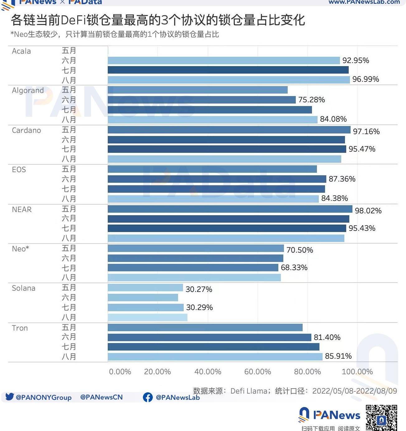 值得关注的是,Acala近期的锁仓量增幅十分抢眼,从上线后的1.21亿美元上涨至当前的4.00亿美元,涨幅高达229.89%,而且这种大幅上涨还发生在市场较为低迷的环境下。作为波卡系的先锋,Acala的生态建设起步算得上顺利。除此之外,在5月9日至8月9日期间,锁仓量总体上涨的还有Algorand和Tron,涨幅分别达到了32.77%和22.56%。相反,同期锁仓量总体下降的有Solana、Cardano、EOS、NEAR和Neo,除了Neo外,跌幅都在30%以上。其中跌幅最大的是Solana,从56.67亿美元跌至了25.43亿美元,跌幅高达55.13%。从各链锁仓量最高的3个协议的锁仓量占比可以看出公链生态的聚集程度,聚集程度越高意味着公链生态越依赖极个别头部协议,比较容易受到头部协议的影响,生态发展的程度还停留在“点”上,没有扩散至“面”上。根据统计,目前生态发展已经成“面”的只有Solana,本月头部协议锁仓量的日均占比只有32%,是本次观察范围内占比最低的一条公链。其次是Neo,头部协议锁仓量的日均占比约为69%。除此之外其他6条公链的头部协议锁仓量日均占比基本都在85%以上,最高的Acala达到了约97%,这意味着这些公链的生态发展还停留在“点”上。