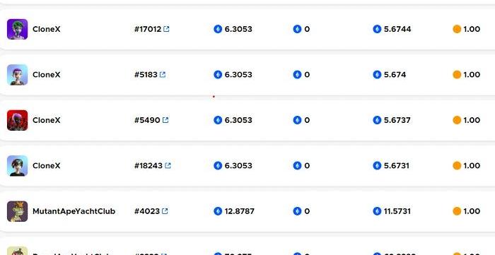 BendDAO规定清算拍卖中的出价必须至少为底价的95%,虽然这有助于遏制死亡螺旋风险,但会导致储户可能陷入价值下跌的NFT,这意味着作为NFT持有者没有ETH可以借入,所以就会出现“挤兑”,因为没有人愿意陷入没有完全支持的债务中。如果我们查看BendDAO的健康因子警报列表,会发现大量BAYC支持的债务健康因子指标已经逼近阙值1,如下图所示: