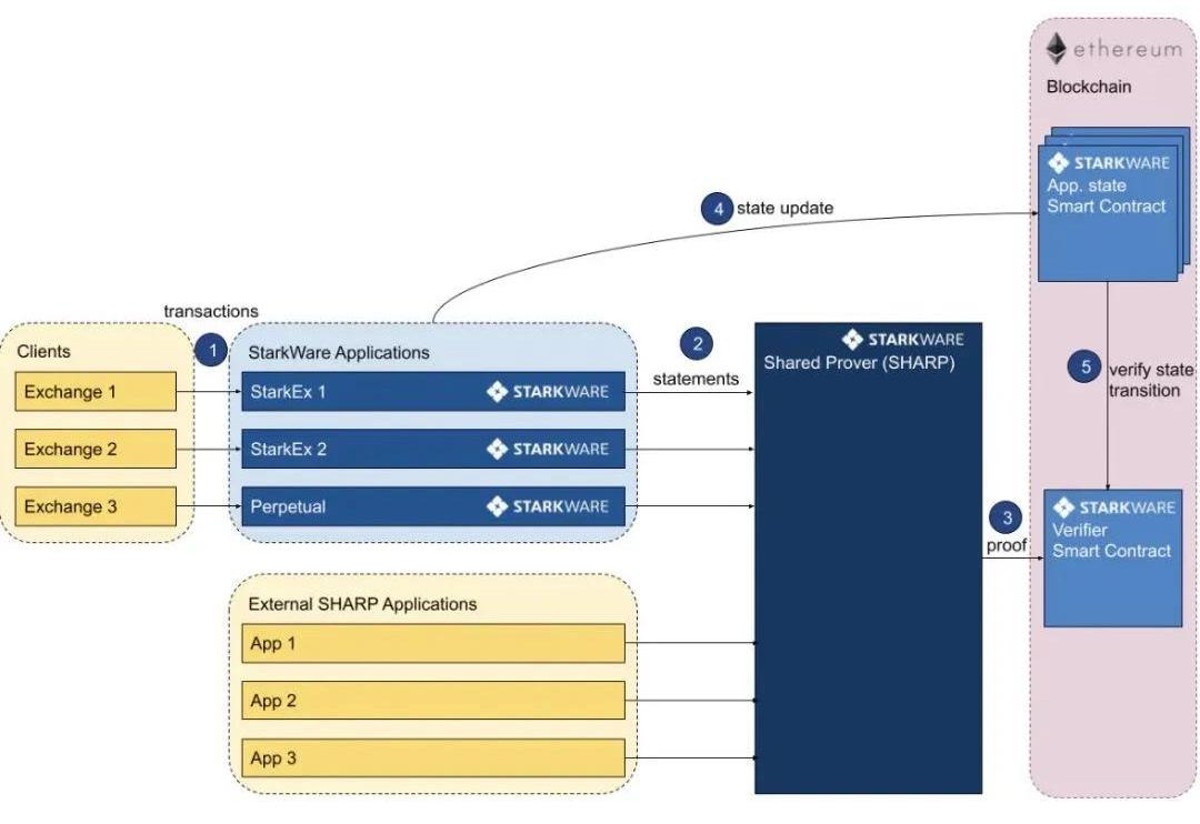 StarkWare堆栈主要由共享证明者(SHARP)和验证者(存在于L1上)组成。SHARP捆绑了来自不同dapp的多个交易,并生成一个证明。然后它与L1上的验证者共享证明。这节省了成本,因为计算是在不同的应用程序之间共享的。验证者检查SHARP证明是否有效。如果是有效,那么它们将在FactRegistry共享。该应用程序可以与StarkEx接口或直接与SHARP(StarkNet应用程序)连接。