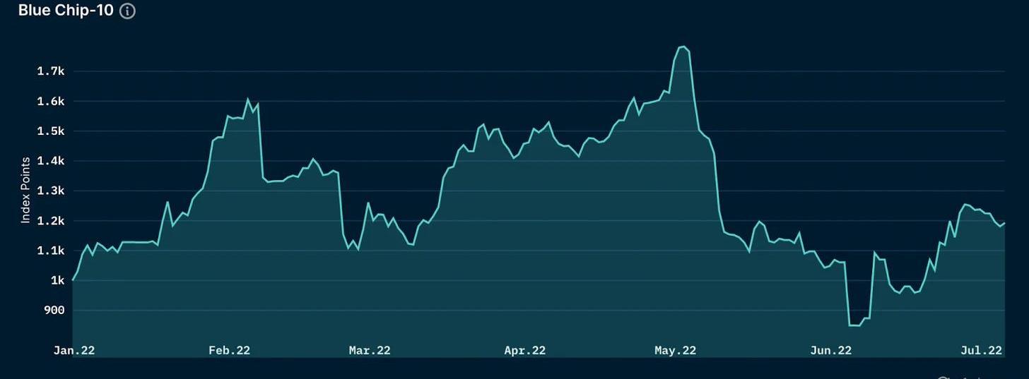 Compound、Aave和Maker的每日清算--来源:DuneAnalytics尽管发生了CeFi大屠杀,以太坊上的DeFi成功地经受住了这场风暴,没有出现任何问题。三个最大的借贷协议,Compound、Aave和Maker成功处理了4.62亿美元的清算,继续以100%的正常运行时间运作,目前的坏账可以忽略不计。有趣的是,DeFi协议的透明性使市场参与者能够监测像Celsius这样的实体头寸,Twitter上的分析师也可以对贷款人财务的不稳定状态提供预先警告。尽管在这个熊市中,流动性可能已经枯竭,活动放缓,但链上金融系统的价值主张从未像第二季度那样清晰。NFT仍旧火热