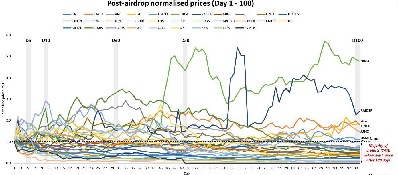 在更长的时间范围内,结果并没有什么不同。下图显示了在更长时期内空投代币价格的下降趋势,平均价格从第5天的0.99下降到0.44。