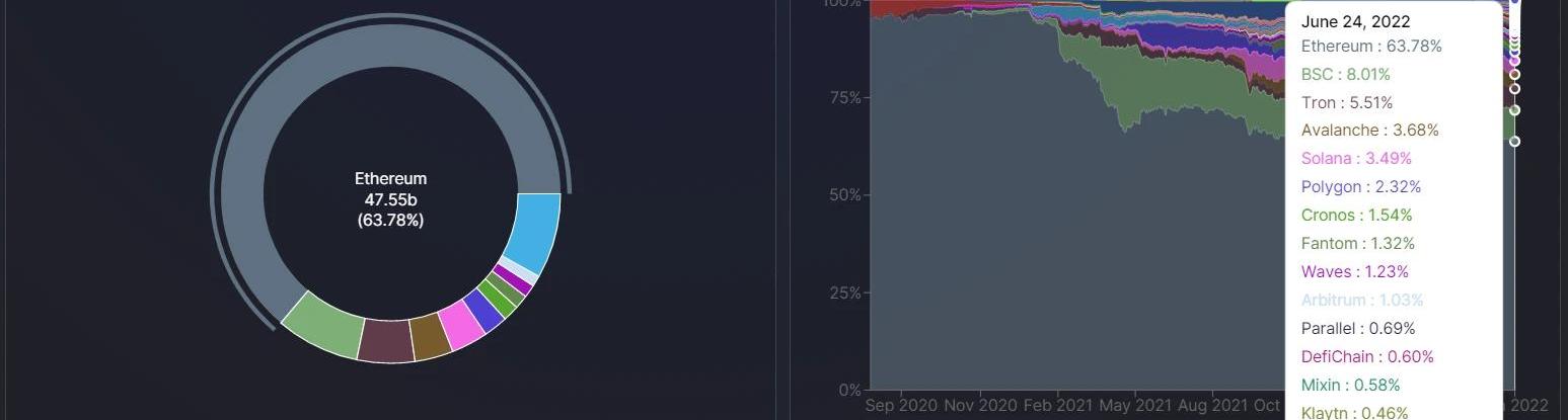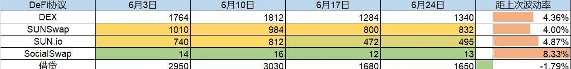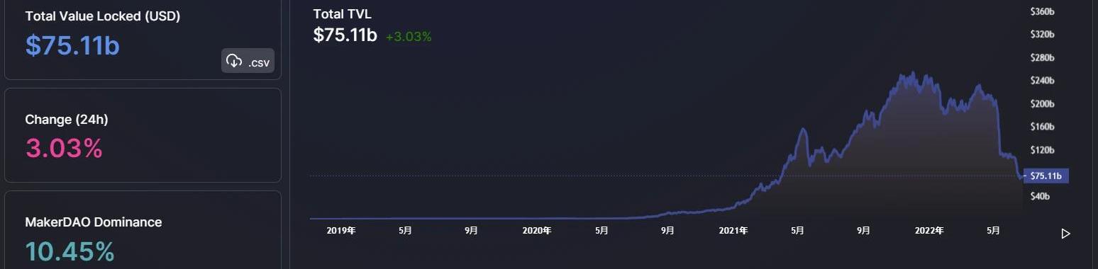 本周伴随行情端出现小幅回弹,对比上周整体TVL增长0.53B,上涨幅度0.71%。各公链TVL占比情况