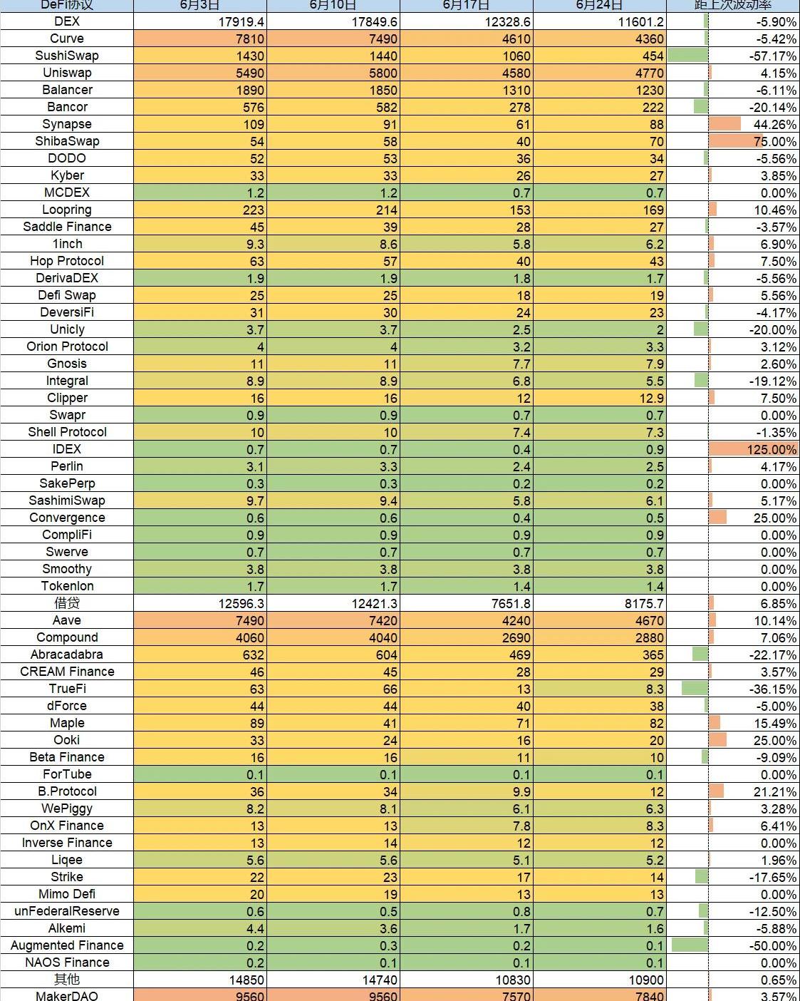 本周BTC大幅下跌10%,市场全线下跌。本周因大机构的流动性危机,导致BTC和ETH作为借贷/杠杆头寸的常用抵押品被大幅清算,表现落后于很多山寨币。在DeFi中,SNX、MKR、LINK、UNI和1INCH在过去60天的表现都好于ETH。