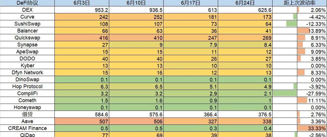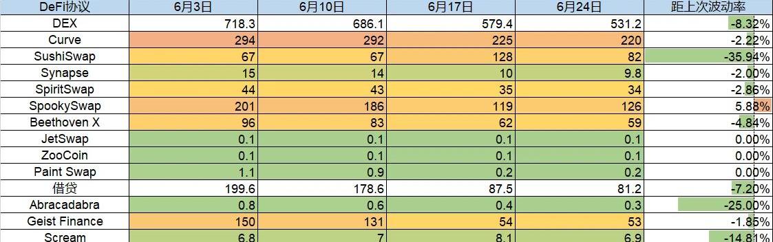 8、本周协议情况总结当前行情背景下,Defi整体表现依旧不佳,除个别DEX出现轻微反弹外,整体仍以下跌为主,本周Solana链交易较为活跃,多个DEX均出现一定幅度增长,Fantom链则出现流动性下降。ETHGasfee历史情况