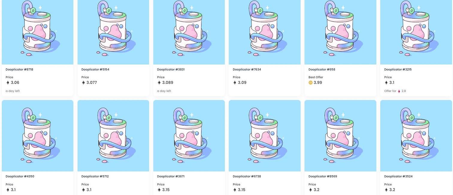 本周NFT市场自5月1日下跌以来,出现了单周最大反弹,整体NFT市场价值上涨超15%,但整体交易量并未出现明显上升,本周值得关注的项目是Dooplicator,其为Doodles团队的二期项目,目前仍是盲盒状态,当前地板价约为3个ETH,对比Doodles的14个ETH的地板价,仍有较大增长空间。