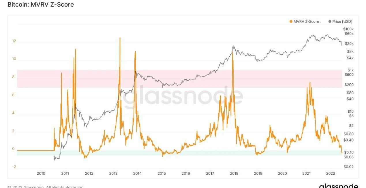 长期趋势指标MVRV-ZScore以市场总成本作为依据,反映市场总体盈利状态。当指标大于6时,是顶部区间;当指标小于2时,是底部区间。当前指标为-0.16,已经接触到历史大底部的绿色区间。
