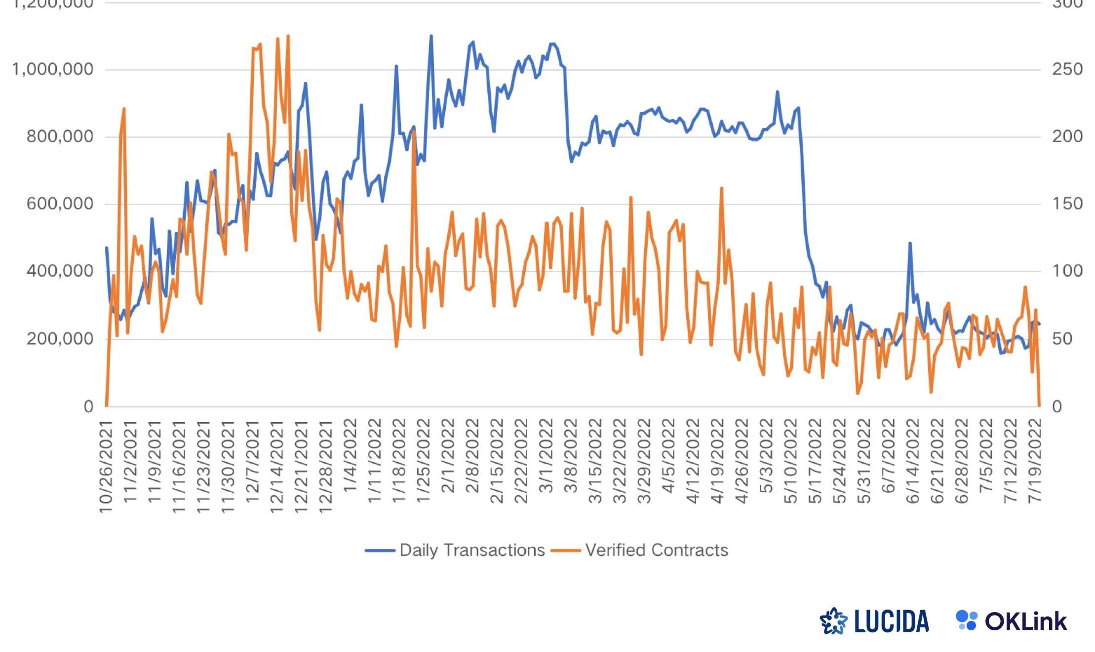 公链始终是加密用户热衷的投资赛道,在本轮市场从牛市到逐渐转熊的过程中,公链数据指标因市场环境变化而产生的波动为公链投资提供了一个良好的分析样本。我们选取了本轮市场变化中比较具有代表性的公链,从链上数据的角度回顾这些公链的表现,试图分析哪些数据指标对于公链投资具有指导意义。1.从链上生态活跃度和锁仓量指标回顾本轮市场