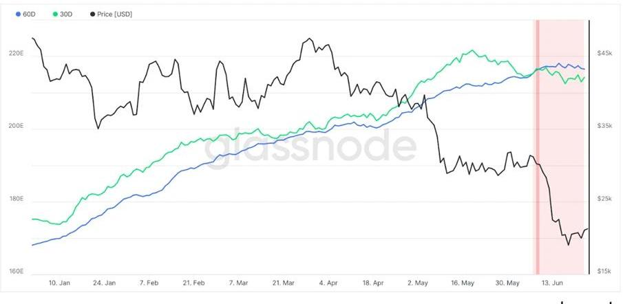 持有BTC股份的上市公司“例如,Microstrategy的比特币资产未实现损失超过12亿美元。此外,像三箭资本这样的加密货币基金和像摄氏这样的贷方保持长期杠杆头寸。暴露于加密货币的股票在他们的投资中陷入困境,而强制清算其资产可能需要比特币价格进一步贬值。“此外,该公司指出,比特币一直与其生产成本,即挖矿过程保持着一种关系,这为挖出的BTC的全部维持价格提供了一个重要的指示。Glassnode指出,目前的生产成本约为17,600美元,这是上周末价格开始回升前达到的低点。