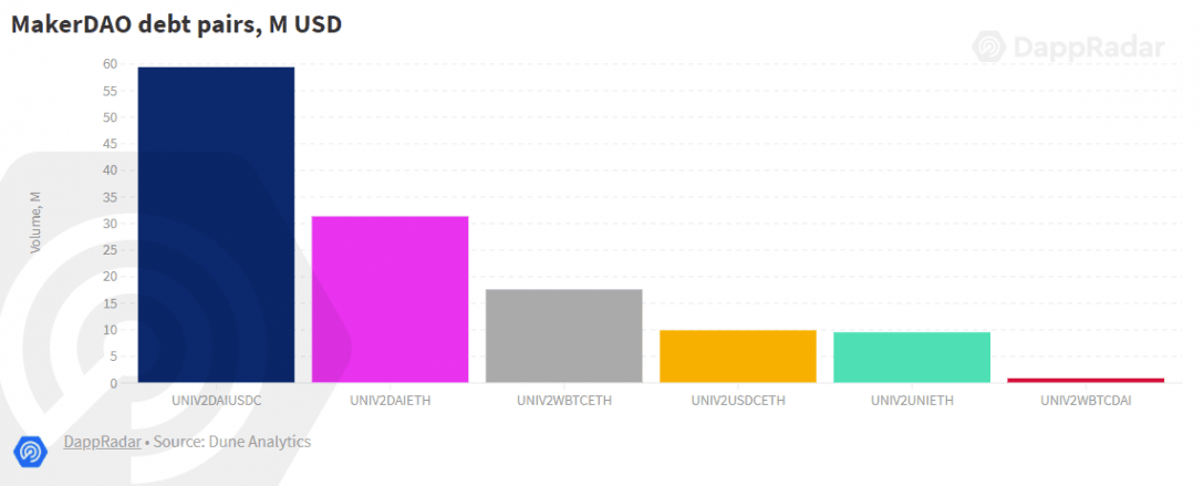 与其他借贷Dapp不同,Maker不接受借贷交易。在Maker中,用户只能通过在接受的加密货币中存入抵押品或使用接受的代币创建新的保险库来借入DAI。最受欢迎的债务对包括Uniswap中提供的流动性对,这也有助于突出领先的DeFi协议之间存在的交互。