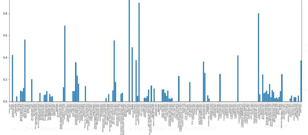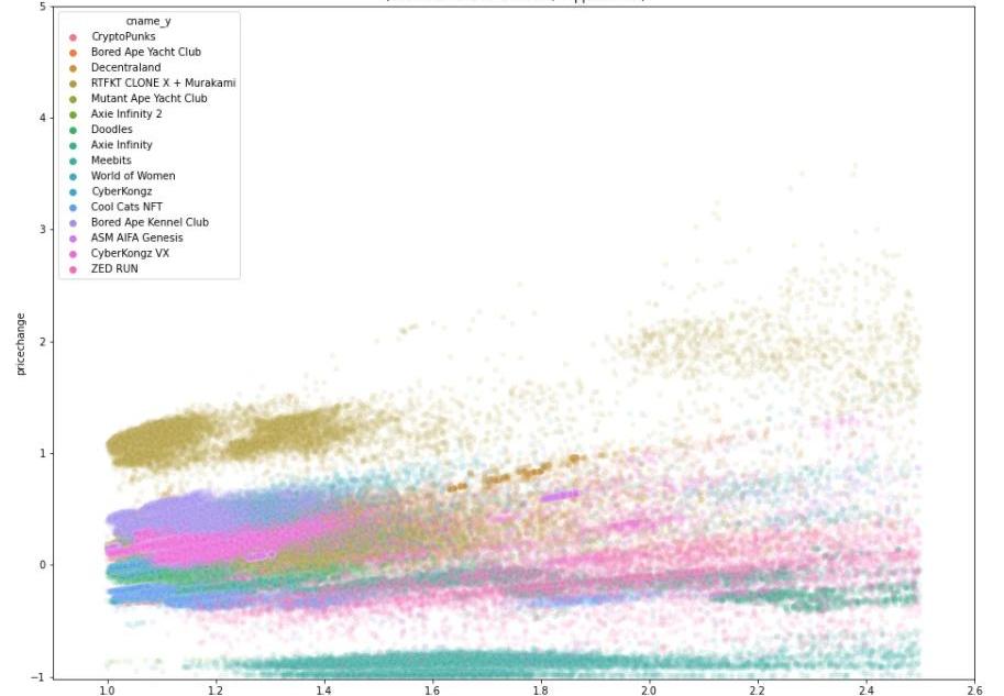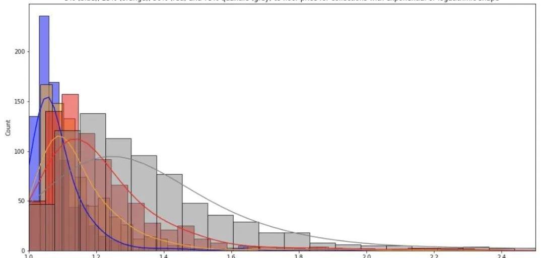 从1月和2月的数据中拉取的537个系列中,有166个的价格分布形态发生了变化。1月至12月,我们也看到了类似的变化比例(25%)。这听上去好像很多,但请记住,前文对NFT系列分布形态的分类是略显模糊的,因为我们的分类标准不是很严格。例如,可以按照”如果众数>地板价=>对数正态”的逻辑来区分指数式衰减和对数正态。看看下面的众数地板价比,我们选择了更宽松的定义,甚至允许众数比地板价高出10-20%,因为我们采用了拟合分布来对形态进行分类。