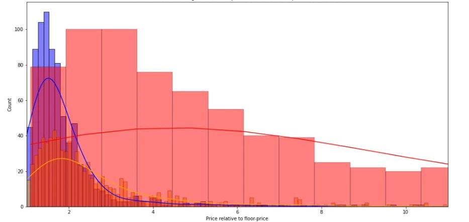 顶层:或”蓝筹”。商品定价大于地板价*2.5。蓝筹通常在商品中占比大约5–10%,占一个系列市值的20–40%。蓝筹的分布噪声很高而且价格变化也很大,其表现类似于“传统”艺术品或房地产中的高端项目。虽然它们的交易量和频次都很低,但蓝筹用作抵押品或通过拆分获得流动性的潜力很大。