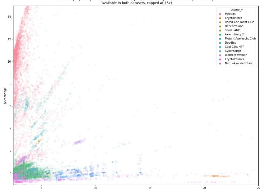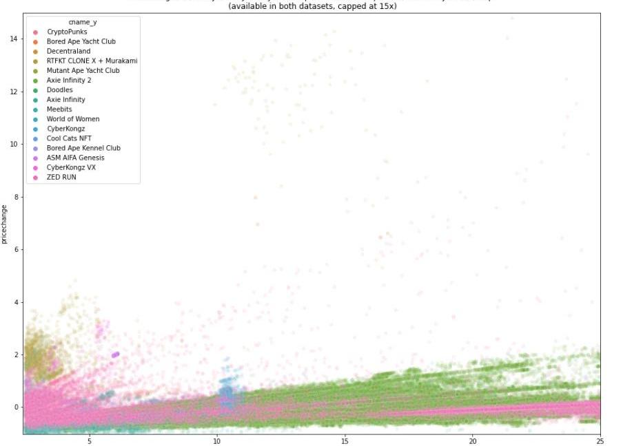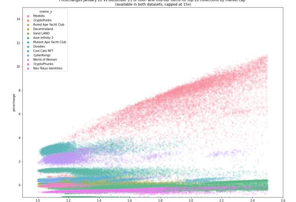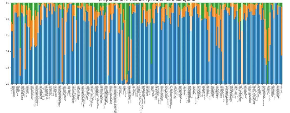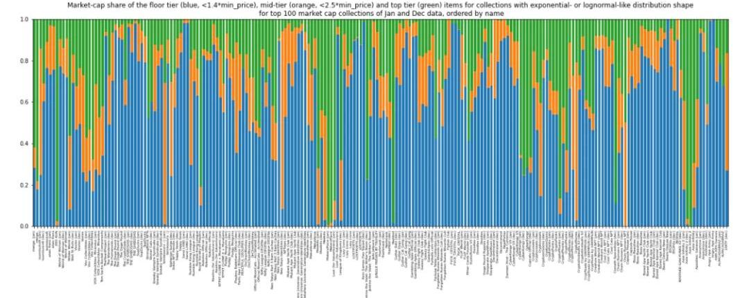 图中NFT系列的名称太小,但末尾的'(jan)'或'(dec)'分别标明了数据集出自1月或12月。这些价位的市值份额数据略显嘈杂。虽然地板层似乎仍占大部分,但NFT系列中通常会存在高出地板价10-1000倍的蓝筹,从而大量占据该系列的市值。总体而言,约25–50%的市值属于地板层,10–20%属于中间层,20–40%属于顶层:
