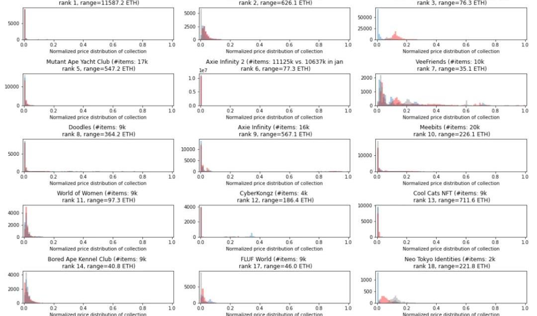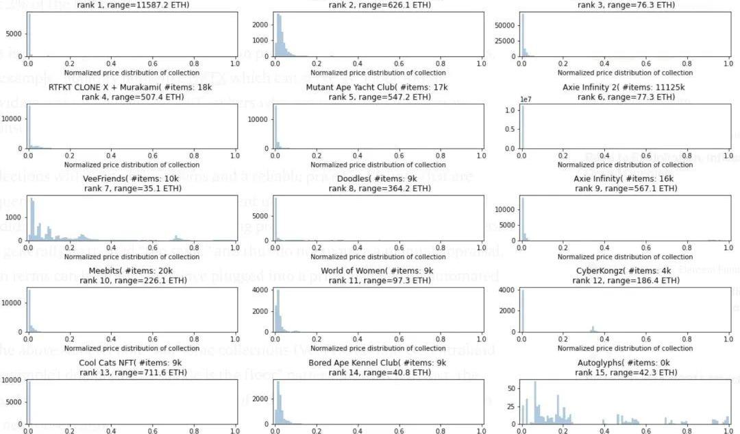 在所有系列中,市场集中在前10个市值占比大于60%的NFT系列上,其基尼系数约为0.9。NFT系列内,价格分布大都遵循同一模式,即大多数NFT的价格都接近地板价。少量剩下的那些构成了价格区间的主体,因此对该系列NFT的总市值贡献巨大。归一化价格分布图表的实例:
