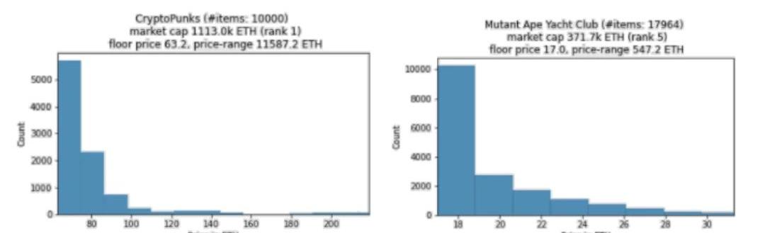 NFT类型是对NFT项目和系列进行评估的常用框架。但是,这些资产属性中较少被论及,有时甚至让人感到违反直觉的,是系列内的价格“等级”,以及同价位资产在不同系列和类型中的表现。GringottsDAO以成为NFT持有者获得流动性的一站式商店为使命。随着新的NFT金融化协议迅速出现,对于用户在寻求何种NFT类型的流动性,我们开始评估不同方法的有效性。我们没有只关注资产类别,而是研究了所有这些资产共有的属性——价格。更具体地说,我们试图回答3个问题:NFT的价格在整个市场上的分布情况如何?是否出现了价格分布的模式,如果是,这些模式有多常见?从这些分布中,我们该如何界定价格“等级”,从而可以为特定的NFT找到更适合的流动性方法?主要发现之一是,跨系列和类别的NFT商品,比同一系列内商品的行为表现得可能更相似。因此,价格分布分析可以让用户和开发人员更全面地了解在哪里最能找到流动性,以及金融化方法的可实现市场。01方法