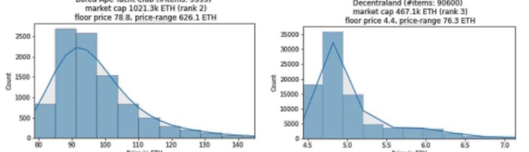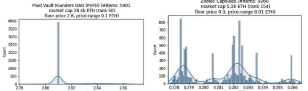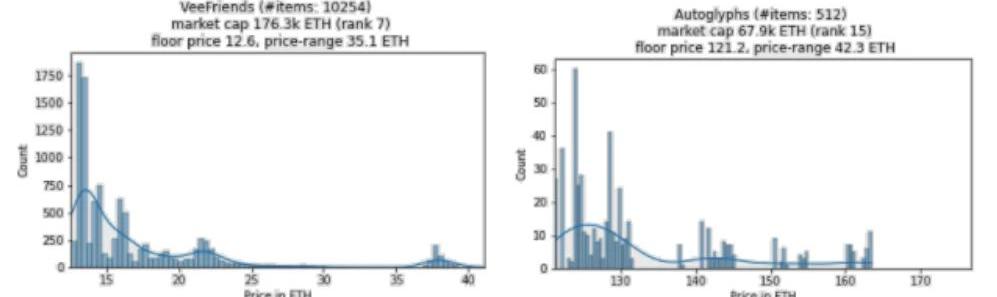 多模态分布则在更大的区间内出现几处凸起和峰值。我们的抽样中约20%的NFT系列呈现这种情况。示例包括VeeFriends、Autoglyphs和FLUFworld。