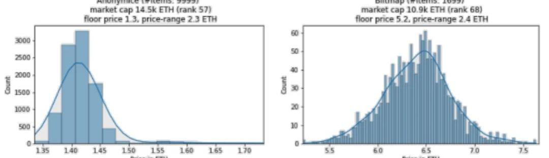 对称分布表现为资产高度集中在平均价格附近,向两侧逐渐减少。在我们的抽样中约5%的NFT系列呈现了这种情况。示例包括Anonymice、Blitmap和Rollbots。