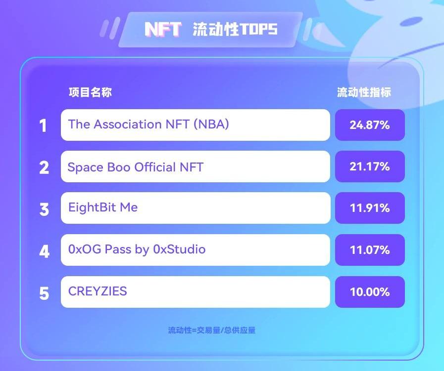 按过去24小时流动性指标,排名前五的项目分别为TheAssociationNFT(NBA)、SpaceBooOfficialNFT、EightBitMe、0xOGPassby0xStudio和CREYZIES。