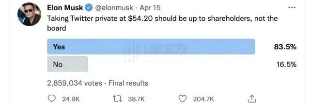 4月14日,马斯克在提交给SEC的文件中,提供了一份报价:愿意以每股54.2美元的价格收购推特。这位不久前的推特最大股东表示,推特需要转型为一家私营公司,这份报价是他个人能给出的最好的,也是最后的报价。54.2美元意味着马斯克给了推特超430亿美元的估值,超过当前市值。突如其来的利好也反映在了市场上,推特大涨。在报价的最后,马斯克也给出了他私有化推特的理由。他认为,他投资推特的原因是相信它现在已经具备成为一个全球言论自由的平台的潜力,但当他投资推特后发现,推特既不会繁荣发展,也无法满足社会的需求。所以他认定推特需要转型成为一家私人公司。「推特拥有着非凡的潜力,我将会释放它。」马斯克在最后写道。大部分人还是对推特易主这件事非常有兴趣,马斯克自己发起的投票显示,在286万的总投票量中,83.5%支持马斯克收购推特。