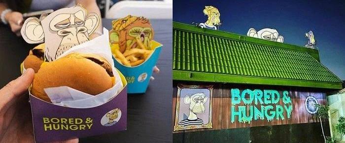 这家餐厅刚开张时门口大排长龙的情景还历历在目,直到现在想来打卡的顾客还是源源不断。餐厅的停车场面积虽然不大,但基本够用。当你走进这家主题餐厅的时候,首先映入眼帘的是两个“无聊猿和变异猿”NFT的巨大广告牌。这种感观像极了把“瑞克和莫蒂”与“海绵宝宝”放在一起的效果——只不过现在是将两只猿猴与牛肉汉堡捆绑在了一起。