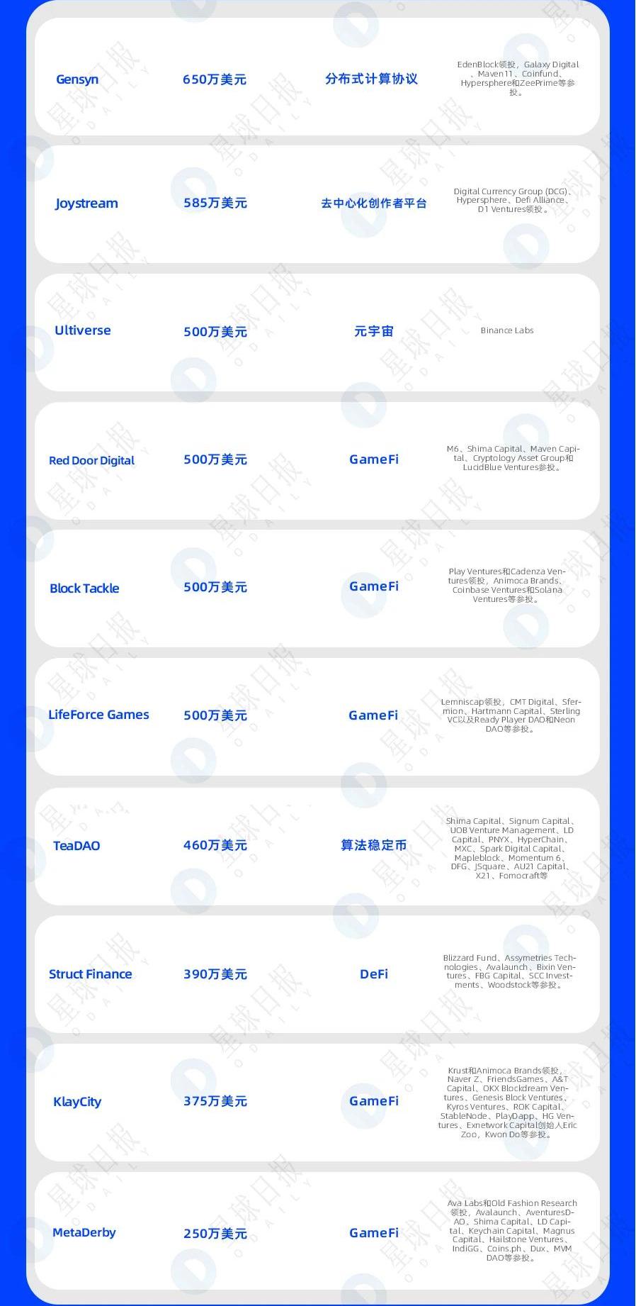 以下为具体融资事件:YugaLabs以40亿美元估值完成4.5亿美元融资,a16z领投,Google、Samsung、Adidas等参投星球日报讯YugaLabs今日宣布以40亿美元估值完成新一轮4.5亿美元融资,也是截至目前NFT行业最大一笔融资。本轮融资由a16z领投,AdidasVentures,AnimocaBrands,Samsung,GoogleVentures,TigerGlobal,FTXVentures,CoinbaseVentures,Moonpay等参投。同时,a16z的合伙人ChrisLyons将加入YugaLabs的董事会。YugaLabs表示,本轮融资将用于开启游戏及并推出自己的元宇宙项目:Otherside。BAYC联创WylieAronow表示Otherside希望构建一个“游戏化”和“完全去中心化”的“可互操作世界”,同时吸引更多的NFT项目进入自己的生态中。比特币矿企GreenidgeGeneration完成超过1亿美元融资比特币矿企GreenidgeGenerationHoldingsInc.周四宣布已完成两笔融资,总金额约为1.08亿美元,以便为公司提供额外的流动性,为2022年的业务扩张提供资金。融资包括NYDIG关联公司提供的约8140万美元贷款,由2022年交付的部分比特大陆S19JPro蚂蚁矿机担保,以及由B.RileyFinancial,Inc.关联公司提供的2650万美元的担保票据,由Greenidge在南卡罗来纳州斯巴达堡的工厂不动产担保。板球NFT平台FanCraze完成1亿美元A轮融资,InsightPartners领投星球日报讯基于Flow板球NFT平台FanCraze完成1亿美元A轮融资,InsightPartners领投,BCpital,MiraeFinancial,TigerGlobal,CoatueManagement,SequoiaCapitalIndia,CourtsideVentures参投。据悉,C罗也参与了投资。游戏开发商Gamefam完成2500万美元融资,Konvoy和PlayVentures领投游戏开发商和发行商Gamefam宣布完成2500万美元A轮融资,Konvoy和PlayVentures领投,MakersFund、BessemerVenturePartners和GalaxyInteractive参投。本轮融资资金将用于在元宇宙平台Roblox上开发游戏。NFT价格评估协议Upshot完成2200万美元融资,PolychainCapital领投NFT价格评估协议Upshot完成2200万美元A2轮融资,PolychainCapital领投,其他具体融资信息暂未透露。此轮融资资金将用于定价模型的研发、建设团队,并为新型DeFi原语和相关开发工具提供资金。据悉,Upshot此前的投资者包括FrameworkVentures、CoinFund、BlockchainCapital、SlowVentures、MechanismCapital、DelphiDigital等。Cosmos智能合约平台开发商PhiLabs完成2100万美元种子轮融资,CoinFund与Hashed领投Cosmos智能合约平台开发商PhiLabs完成2100万美元种子轮融资,CoinFund与Hashed领投,1confirmation、IDEOCoLab、Figment、BlockchainCapital、Wintermute、ChorusOne、stake.fish、Lemniscap、Cosmostation和HypersphereVentures等参投。据了解,PhiLabs开发的Archway协议是一个基于Cosmos并奖励开发者的激励性智能合约平台,该协议为开发人员提供了快速构建和启动可扩展的跨链DApp的工具,并因DApp对网络的贡献而获得奖励。时尚元宇宙平台Altaba完成约902万美元融资,AnimocaBrands领投时尚元宇宙平台ALTAVAGroup已完成了约110亿韩元的融资,Blocore和AnimocaBrands领投,Wemade、SpartanGroup、SkyVisionCapital等机构及TheSandbox联合创始人SebastienBorget、币安前首席财务官WeiZhou等私人投资者参投。资金将用于Altaba提升服务、招聘人才并扩大营销。据悉,ALTAVAGroup是一家总部位于新加坡、在韩国开展业务的公司,其目标是让奢侈品时尚和零售在元宇宙中大众化。据此前消息,TheSandbox与ALTAVAGroup合作,拓展元宇宙中的奢侈时尚和生活方式品牌。加密数据公司TheTIE以1亿美元估值完成900万美元A轮融资,Blizzard领投加密信息服务提供商TheTIE以1亿美元估值完成900万美元A轮融资,Blizzard领投,GoldenTreeAssetManagement、NYDIG、HudsonRiverTrading、RepublicCapital、GeminiFrontierFund和Nexo等公司的高管参投。此外,该公司宣布AvaLabs总裁JohnWu将加入其董事会。据悉,TheTIE的核心产品是SigDev终端,它在单一平台上提供市场、公司和新闻数据。利用新融资,该公司计划扩展三个垂直领域:机构解决方案、数据再分配和代币关系。RibbonFinance完成875万美元B轮融资,Paradigm领投融资平台AngelList的数据显示,链上结构化产品RibbonFinance完成875万美元B轮融资,Paradigm领投。截至目前,RibbonFinance总融资额达1660万美元。2021年1月,RibbonFinance完成185万美元种子轮融资,投资方包括DragonflyCapital、Coinbase、Nascent、ScalarCapital。2021年8月,RibbonFinance完成600万美元A轮融资,投资方包括DragonflyCapital、RobotVentures、Nascent。据悉,RibbonFinance于今日早些时候推出ApeCoin看涨期权金库。开源软件构建平台Tea完成800万美元种子轮融资,BinanceLabs领投链上开源软件构建平台Tea完成800万美元种子轮融资,BinanceLabs领投,XBTOHumlaVentures、LatticeCapital、DARMACapital、CoralDeFi、DLTx、Woodstock、Rocktree、SVKCrypto、MAKEGroup等参投。本轮融资资金将用于扩大团队,继续推进其在协议、软件和社区发展方面的工作。分布式计算协议Gensyn完成650万美元种子轮融资,EdenBlock领投分布式计算协议Gensyn宣布完成650万美元种子轮融资,EdenBlock领投,GalaxyDigital、Maven11、Coinfund、Hypersphere和ZeePrime等参投。Gensyn是一个分布式计算网络,该网络使用区块链来验证深度学习任务是否已正确执行,并通过代币触发支付,通过这种可验证的方式将未使用的计算能力货币化。去中心化创作者平台Joystream以6000万美元估值完成585万美元融资,D1Ventures等领投去中心化创作者平台Joystream以6000万美元估值完成585万美元融资,DigitalCurrencyGroup(DCG)、Hypersphere、DefiAlliance、D1Ventures领投。此外,Joystream准备在今年第二季度或第三季度推出一个主网,将允许自定义DAO、创作者视频的NFT市场以及创作者使用自己的代币通过视频获利的平台。链