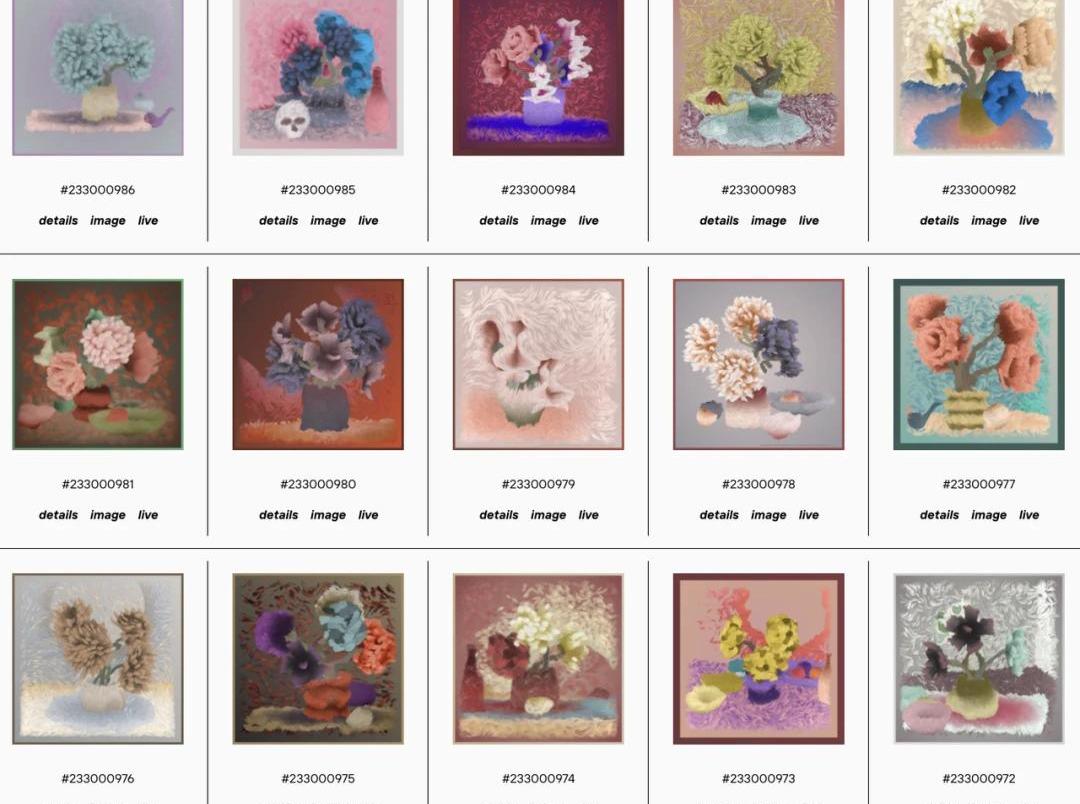 Chimera#488,画面本身是动态的,观赏者还可以通过缩放和它交互爱好者会把MichaelKozlowski称为“生成艺术的莫奈”,他在创作过程中似乎也对莫奈进行了致敬:Chimera的母题是新与旧、数字和模拟、2D和3D的融合。同时它还代表了静物绘画的许多方面。比如一个特别有趣的特征,Chimera有12种画笔风格,包括油、木炭、水彩,甚至纺织品。弄清楚如何用代码更好地实现每种模拟风格的过程让我很开心。有些风格会更加稀有,但是我认为每一种风格都是对其现实对应物的致敬。我还花了大量时间在每件作品的中心主题——花朵——上。一共有8种花,包括玫瑰和向日葵等。每束花最多可以由10朵不同品种的花组成。每朵花的形状完全由数学函数定义,没有使用预先制作的3D模型。每一朵花都是独一无二的,并且尽可能贴合现实生活中对应的花朵。你会注意到兰花很独特,而向日葵则是我对梵高、莫奈和其他印象派向日葵作品的致敬。04、ArtBlocks与艺术家的互相成就