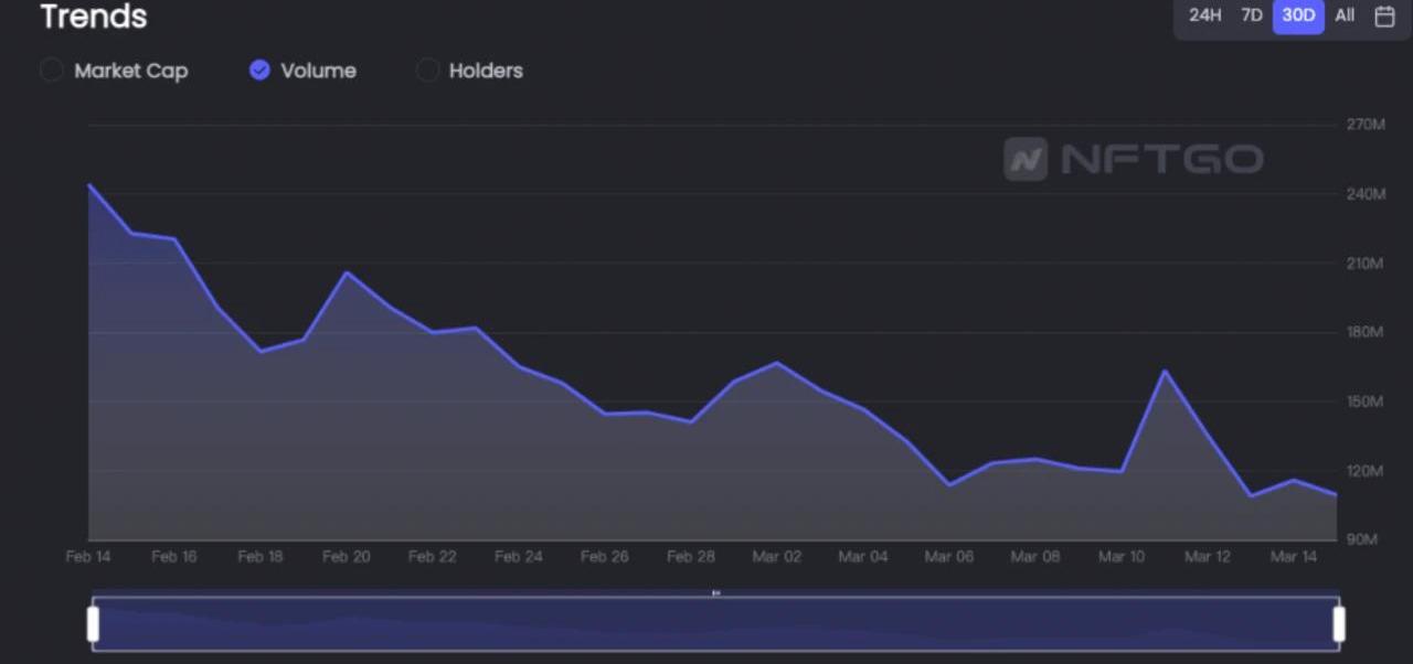 根据NFTGo数据,过去30天中,NFT市场交易量呈波动下滑趋势。在下跌期间阶段性小幅度回调多见于新闻向的利好消息,比如YugaLabs的收购事件等。