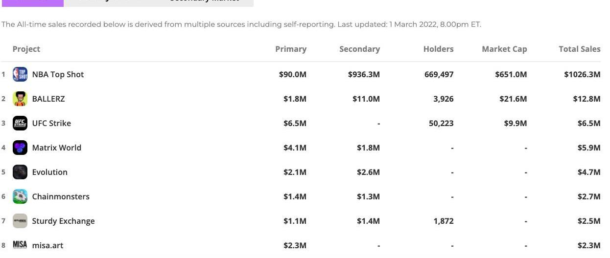 Ronin:Ronin是一条明确为大火的链游AxieInfinity设计的以太坊侧链,也是该游戏的重要基础设施支撑。Roni采用的是PoA共识模型,区块需要获得三分之二的验证者的批准才能获得批准,且验证者负责编写和验证区块,更新价格预言机,并处理往返于Ronin的资产的存放和转移过程等。当前,Ronin网络的验证者包括育碧、币安、AnimocaBrands、Nonfungible和Sparq等。DefiLlama和Cryptoslam数据显示,截至3月10日,Ronin总锁仓量超6.2亿美元,总销售达40.2亿美元。ImmutableX:ImmutableX是首个以太坊Layer2上为游戏、应用、市场交易、NFT提供零Gas费、即时交易和可扩展性的平台,基于与StarkWare合作开发的ZKRollup技术,其核心组件为ZK-Rollup扩展引擎、Link和API。不久前,ImmutableX与GameStop合作推出1亿美元的联合基金,用于投资NFT游戏项目。3月7日,ImmutableX以25亿美元估值完成了淡马锡领投的2亿美元融资,其他机构包括MiraeAsset、ParaFiCapital、DeclarationPartners、腾讯控股等参投。Flow:Flow是由DapperLabs打造的首个主打消费级应用的区块链网络,该团队曾推出Cryptokitties、NBATopShot和ERC-721协议等明星项目。与其他公链相比,Flow通过与NFL、UFC、华纳音乐、NBA和Ubisoft等知名IP的合作成功吸引大批主流世界用户。例如,不久前国际奥委会官方授权冰墩墩数字盲盒在Flow链上交易市场nWayPlay上发售。与此同时,a16z、CoinbaseVentures、GoogleVentures、DCG、Reddit和AnimocaBrands等投资机构的加持也让Flow保持着强大的市场开拓力。如今,Flow链上已搭建247个项目,覆盖收藏、艺术、游戏、DeFi、元宇宙、体育、钱包和DAO等诸多领域。其中,NBATopShot的销售额超10亿美元,其他项目的交易量则逊色不少。