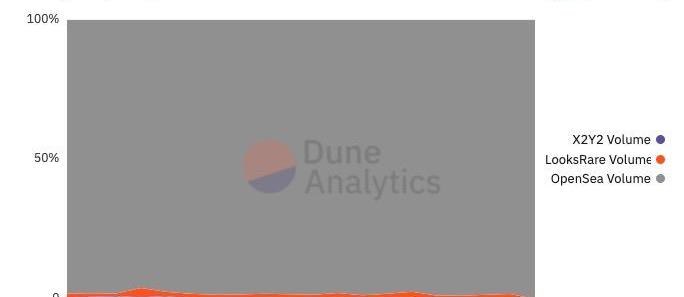 OpenSea、LookRare与x2y2的市场占比|来源:DuneAnalytics不过,自上线以来x2y2并未吸引很多流量。DuneAnalytics数据显示,截至3月10日,X2Y2仅占NFT市场总成交份额的0.2%。收藏