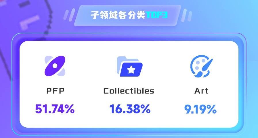 按市场占比,排前三的子领域分别为PFP、Collectibles、Art。
