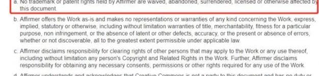 其次,CC0消极明确了,CC0是不涉及著作权?所拥有的商标权或专利权,上述权利不会因本声明?被放弃、让渡、授权或者受到其它影响。