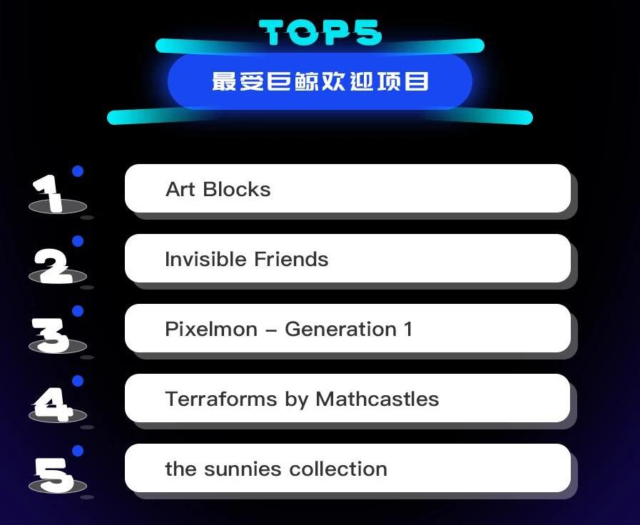 最受巨鲸欢迎项目排前五的分别是:ArtBlocks、InvisibleFriends、Pixelmon-Generation1、TerraformsbyMathcastles和thesunniescollection。