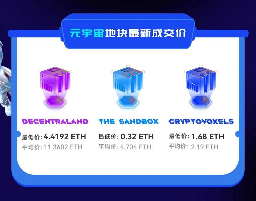 元宇宙平台中,过去24小时内,Decentraland上的地块最低成交价为4.4192ETH、平均成交价为11.3602ETH;TheSandbox上的地块最低成交价为0.32ETH、平均成交价为4.704ETH;Cryptovoxels上的地块最低成交价为1.68ETH、平均成交价为2.19ETH。