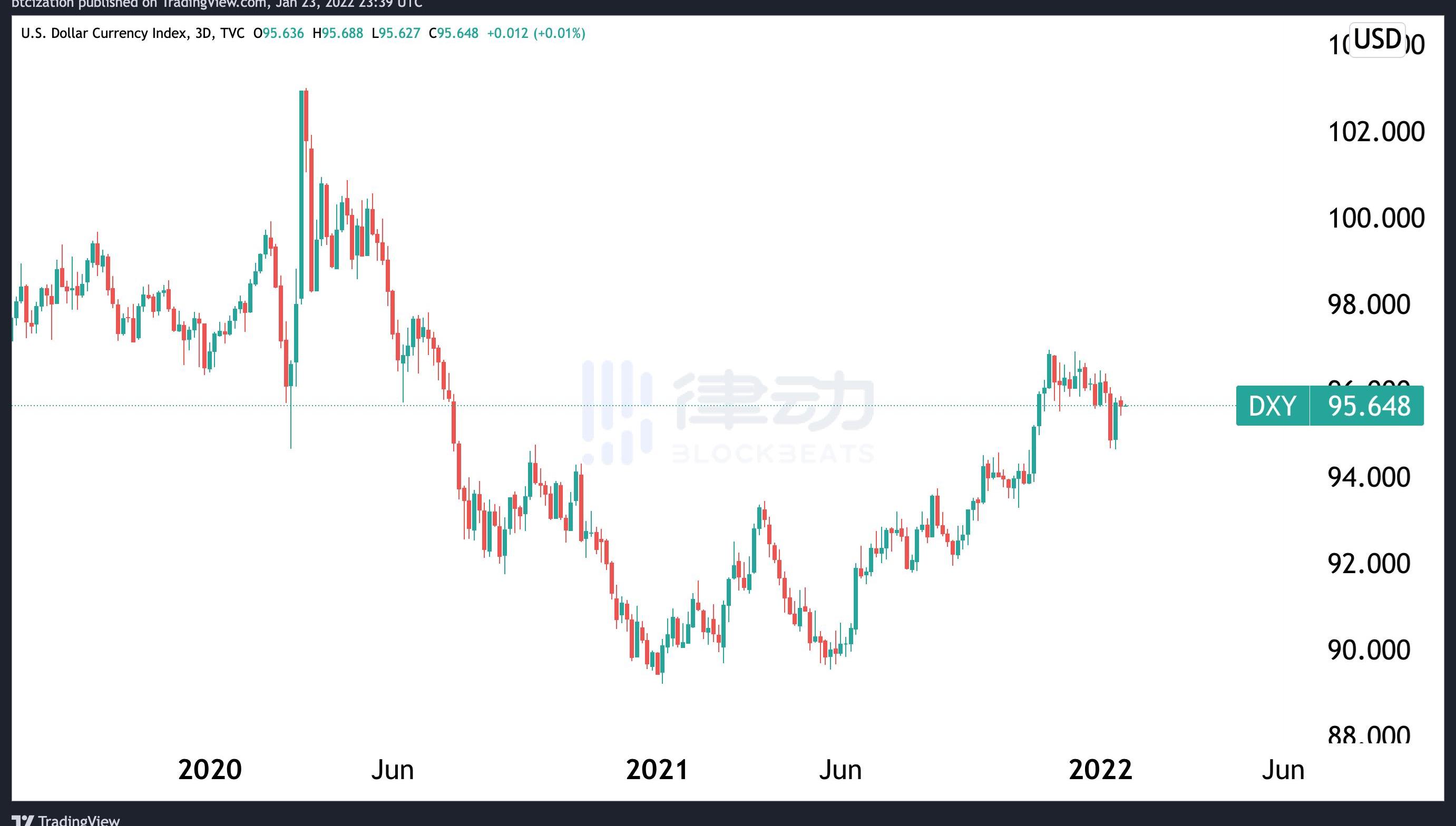 DXY是用于衡量美元兑其他法币价值的指标,自2021年初以来这一指标一直处于上升趋势。随着美联储试图采取紧收政策,关注美元的走强趋势将非常关键,因为强势的美元是任何资产都没有好处。