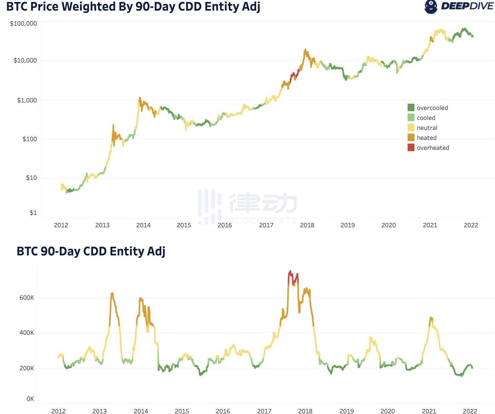 显然宏观层面的担忧是背后的推动因素之一,不过欣慰的是囤币的趋势现在又开始了。Token销毁天数(CDD)是通过将交易中的Token数量乘以自上次使用这些Token以来的天数来计算的,而90天滚动汇总数据一般用于显示资产累积和抛售的相对比值,比特币目前积累趋势强劲。