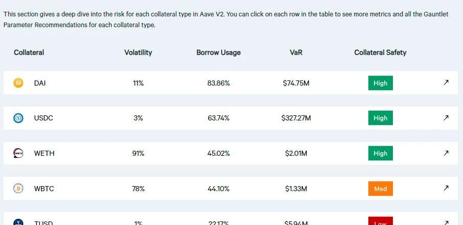 首先,出现了一些量化工具,可以让社区将DAO(以及可能的相关协议)的风险根据市场条件进行可视化,并让DAO成员理解对降低抵押/保证金要求或提高利率进行投票意味着什么。这为DAO金库所存在的风险提高了整体透明度,并允许社区更新金库的组成情况来满足特定的KPI。例如,借贷协议Aave和Compound金库所持有的数十亿美元资产,有效地充当了底层借贷协议的保险后盾。例如,如果出现大规模的价格波动,导致大量贷款违约,给协议中的放贷人(lenders)造成损失,此时这些DAOs可以使用它们的金库来弥补贷款人的损失(比如,Compound协议中的DAI清算事件)。调整协议中的参数(例如调整抵押品需求),有助于减少DAO不得不将资金花在此类突发事件上的可能性。下面是Gauntlet平台的一个实时仪表盘例子,用于监控Aave上的不同市场的风险(披露:我是提供这些服务的Gauntlet平台的创始人和CEO)。这些用于量化风险的工具包含了将算法交易和人工智能(如AlphaGo)中使用的工具结合起来的模拟工具。