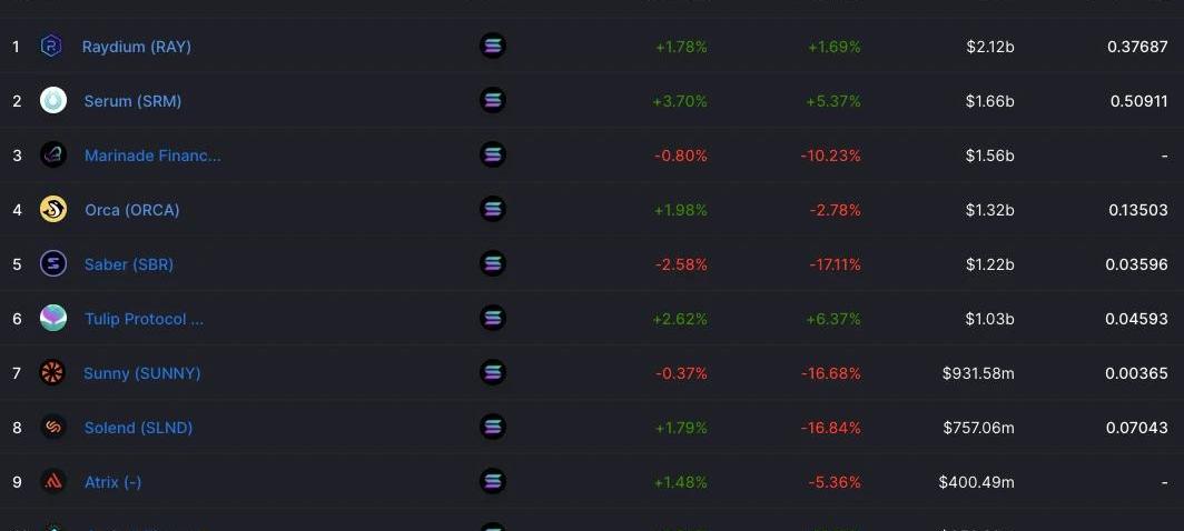 自2017年公链大战打响以来,加密世界见证了以太坊的茁壮成长,EOS、TRX等公链的浮沉,但公链的最终答案仍未出现。到了2021年,更多「解题者」来了,Solana、Fantom、Avalanche等一批追求高性能的新兴公链齐齐落地开花,开启了又一轮公链进阶的探索之路。Solana无疑是这批新兴公链势头最猛的代表者。根据Defillama的数据,截至11月19日,Solana链上总锁仓价值达到124.7亿美元,排在所有公链第三位。位列前两位的分别是以太坊和BSC,链上TVL依次为1667.9亿美元和184.6亿美元。在Solana主网上线之初,它向加密世界描绘了一个宏伟蓝图,即打造一个互联网级别的区块链网络。其官网宣称,高吞吐量是Solana的一大特点,TPS可以达到50000+,这一数字是BSC、Heco等公链的10倍。引人注目的是,Solana的创始团队不仅有来自高通、英特尔和Dropbox等大厂的前工程师,还因FTX创始人、天才交易员Sam的摇旗呐喊,吸引了许多开发者前来。在其主网部署阶段,就有超过100个项目宣布将在Solana进行开发,赛道类别涵盖了DeFi的各个主流板块。今年以来,Solana在建设生态过程中,市值一路扶摇直上。根据CoinMarketCap的数据,当前Solana原生通证SOL流通市值达到600.97亿美元,位列加密资产市值排行榜第6位,一跃成为加密世界的新晋主流。然而,在Solana声名显著、市值高企时,它的链上应用发展似乎没有跟上脚步,无论是头部协议的知名度还是市值都与公链本身相差甚远。Defillama数据显示,当前Solana链上相对活跃的应用仅为30余个,TVL排在前五名的分别为Raydium、Serum、Marinade、Orca和Saber,其中除了Marinade这个流动性解决方案外,其他都属于去中心化交易所。同时,其链上资金分布较为集中,排名前十的协议TVL共计113.5亿美元,占据了整个链上生态的91%。