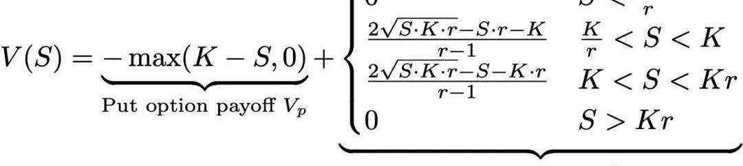 Feynman-Kac公式使计算奇异期权的价值变得容易。我们将应用Feynman-Kac公式来计算Uniswapv3期权的值。为了让事情变得简单一点,我们首先将Univ3LP的价值分解为两个不同的部分V(S,t)=V_p(S,t)+Vρ(S,t),其中V_p=-max(KS,0)是看跌期权的收益,范围收益Vρ是由以下式给出的:
