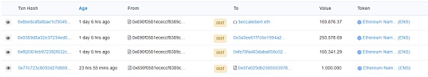 目前,ENS 价格约为 60 美元。以这一价格计算,领取空投最多的用户获得了多少资产?在查询了所有的空投领取地址之后,我们发现了领取空投最多的几个地址。