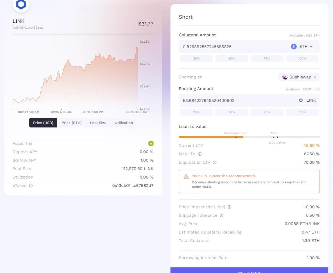 与目前主流借贷平台相比,BetaFinance有以下几个特点:1.无许可的货币市场与Euler一样,BetaFinance同样注意到了主流资产之外的长尾借贷市场,并将其作为主要的目标市场。用户可以自由地创建目前BetaFinance还没有的资产类别,以出借自己持有的加密资产,不过该功能暂时还未开放。2.提供便捷的资产做空体验通过BetaFinance,用户可以通过借入来一键做空某样资产。虽然用户同样可以在别的借贷平台借出资产做空,但是目前面临两个问题:●操作比较繁琐,需要抵押资产、借出做空资产、去DEX卖出做空,时间和合约费用成本都比较高●主流借贷平台只支持主流资产,可选择的范围很小,且主流资产的价格波动较小,做空的潜在收益空间不足而BetaFinance在这两点上正好契合用户需求。首先其为做空者提供了一键式的做空交互界面,用户可以快速选择自己的做空抵押物以及做空对象,Beta便会通过自己的货币市场自动借入对应空头资产并在所选择的DEX卖出做空,然后将把卖出获得的资产继续计入抵押物以降低风险。在这个过程中,用户无需与多个协议进行交互,因此省下了高额的Gas费用,也避免了面对突发的市场机会时的手忙脚乱。